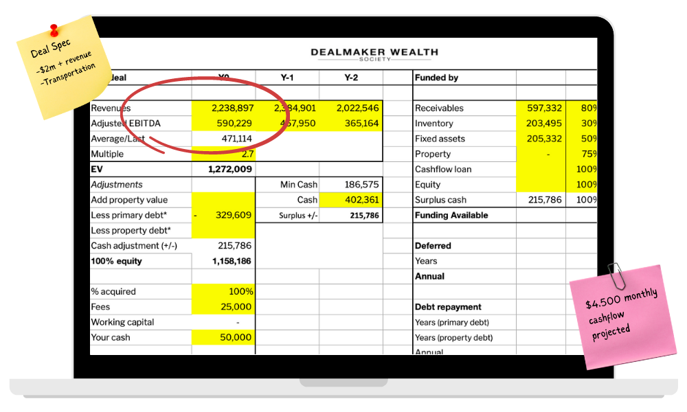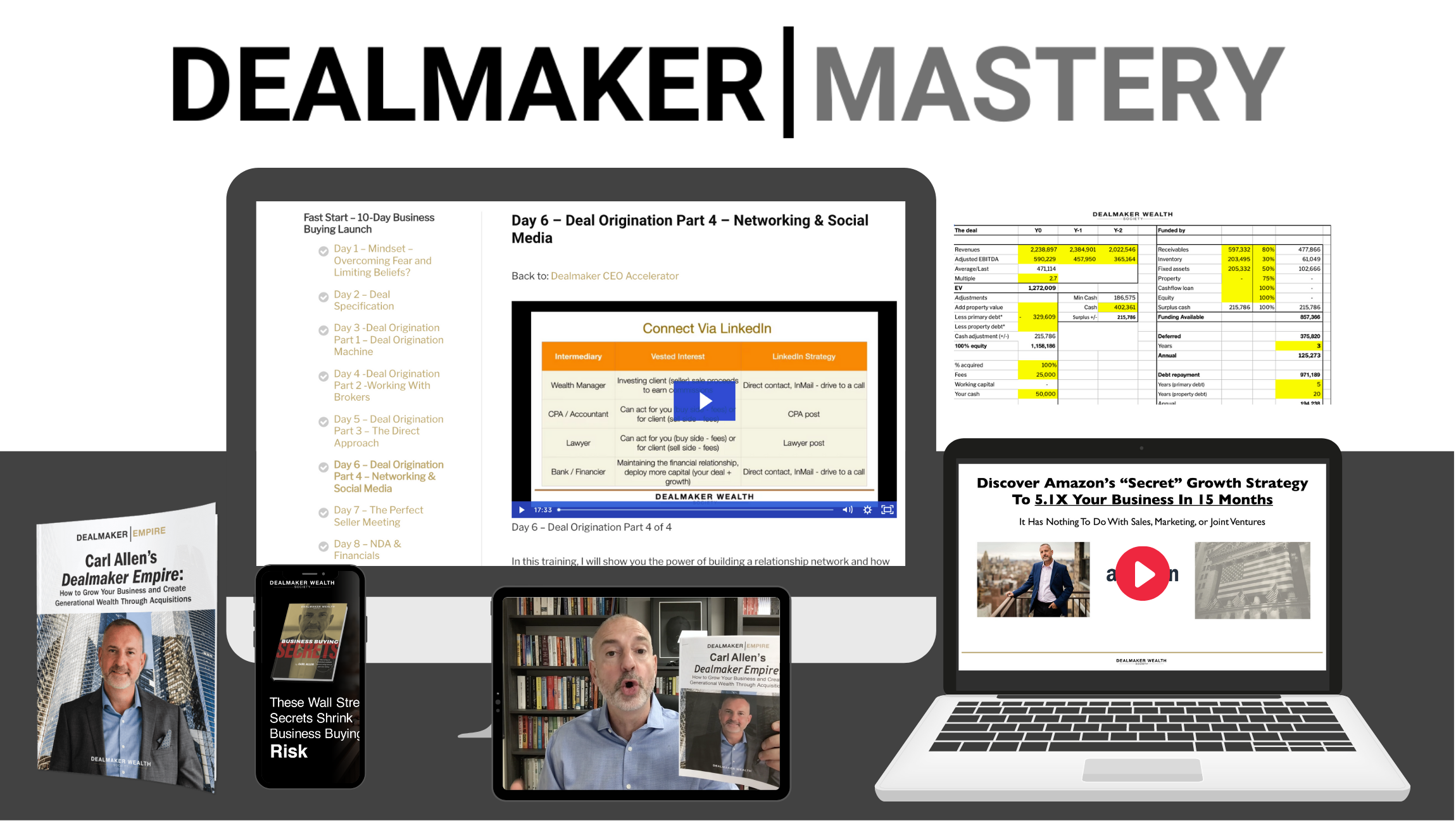 © Dealmaker Wealth Society, LLC (“Dealmaker Wealth Society,” “DWS” or “DWS”) produces, markets, sells, and distributes an online course on how to buy small businesses using M&A strategies like a Leveraged Buyout among other strategies. DWS is strictly a training business focused on business building, and entrepreneurship.